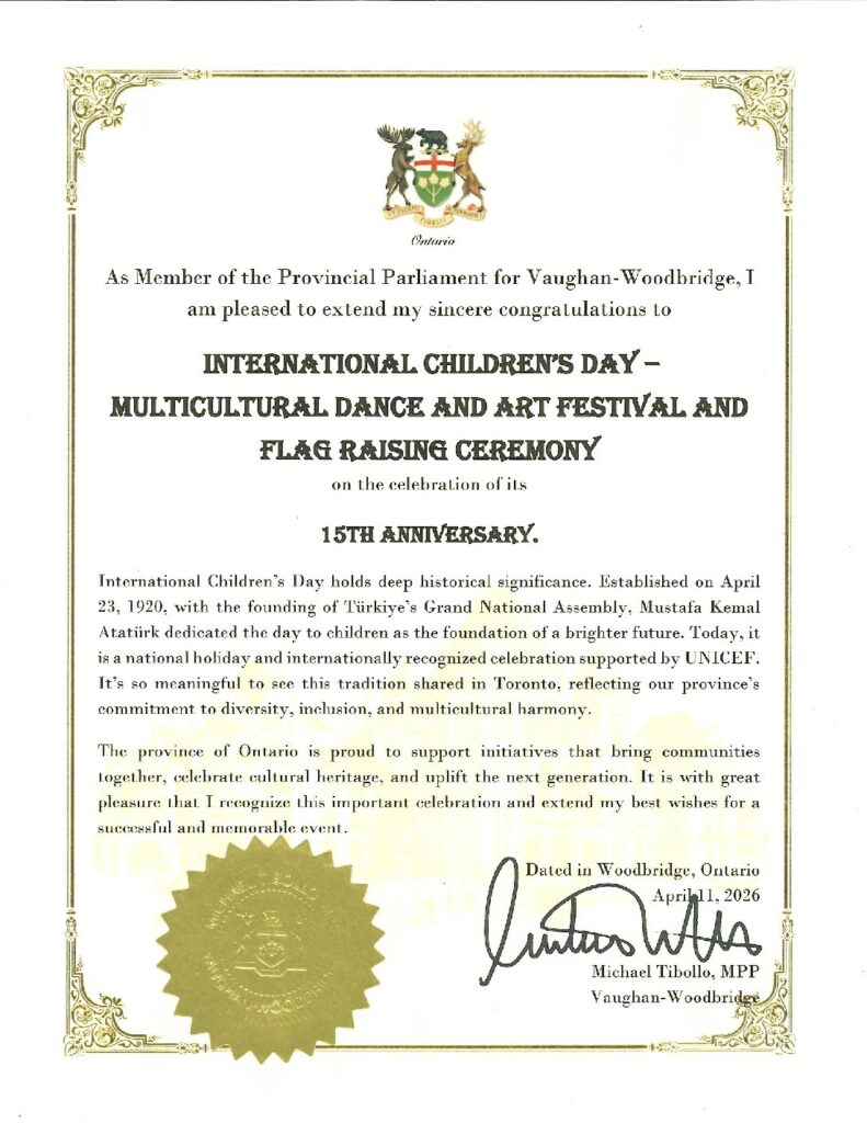 We proudly celebrated the 15th anniversary of the International Children’s Day – Multicultural Dance and Art Festival with great joy at Nathan Phillips Square in Toronto on Saturday, April 11, 2026, as part of the April 23 National Sovereignty and Children’s Day.